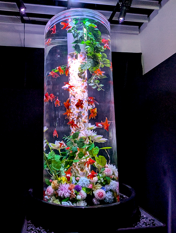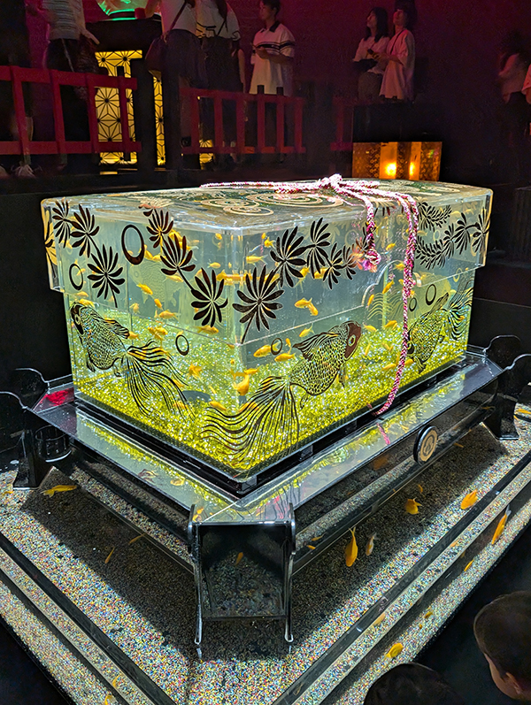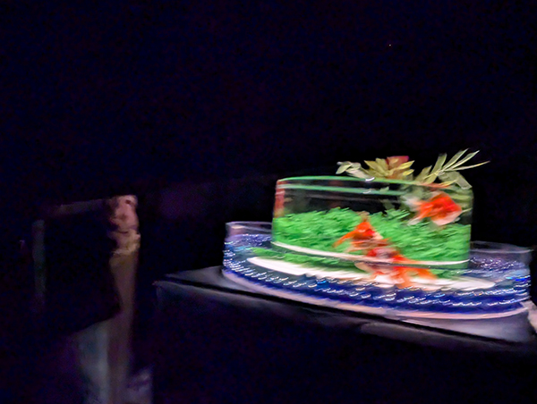 夏休みに、金魚を大きな金魚鉢や水槽に入れ、光や音などを使って芸術的に見せてくれる「アートアクアリウム展 名古屋2025」に行ってきました。玉手箱のような大きな水槽や柱みたいな水槽に幻想的な金魚鉢が光に照らされて、まるで別世界にいるような感覚になりました。子供たちは、自分のスマホを借りて写真を撮っていました。まだ慣れていないのか、うまく撮れずにピンボケでした。