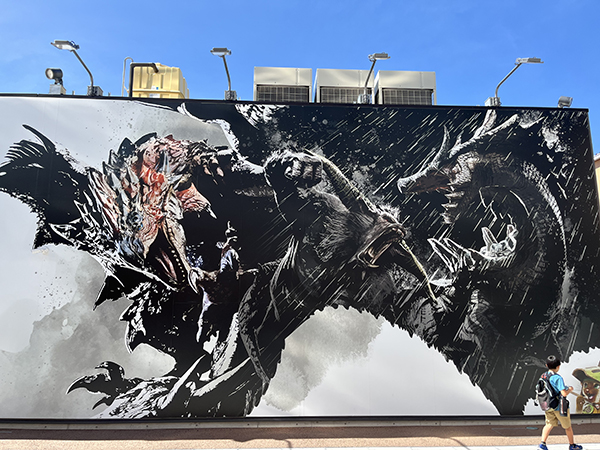 特に楽しみにしていたのが、3ヶ月前の抽選にて、運よく当選して参加することができた「モンスターハンター」の世界を体感できるモンハンパビリオンです。写真はパビリオン前に展示されてた、モンスター達のパネル写真になります。迫力が凄く、圧倒されます。